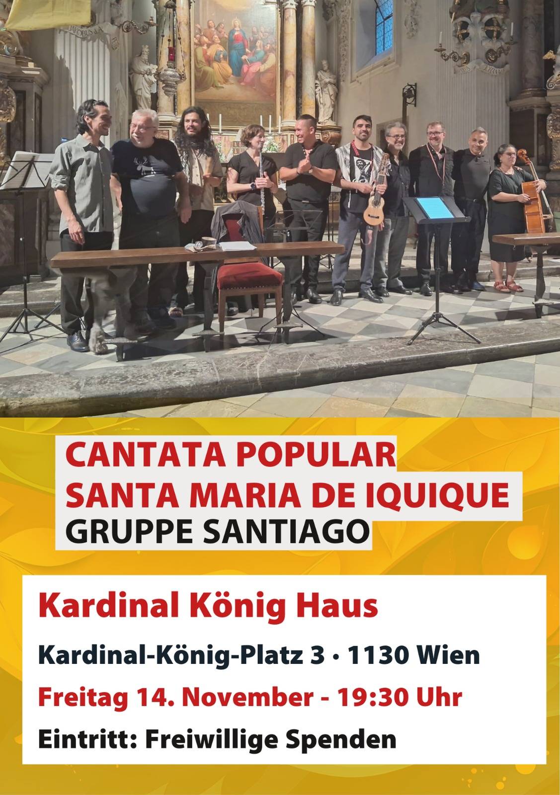 Das nächste Konzert bei Ihnen?: Mailen Sie mir unter richter@audi-max.at ______________________________________Am 14.11.2025 um 19:30 Uhr Konzert mit der "Gruppe Santiago" im "Kardinal König Haus" (Kardinal-König-Platz 3) in Wien:"Cantata Popular Santa Maria die Iquique" ![]() ______________________ Am Pfingstsonntag, 8. Juni 2025 um 18 Uhr im Pfarrsaal der Basilika Wilten spielt das Trio la Clape ein Konzert mit Werken von Bach, Villa-Lobos, Bizet, Ponce und Rossini. ______________________Am 2.11.2024 spielt das Trio la Clape um 19:30 Uhr im Kleinen Saal der Hochschule für Musik und Darstellende Kunst in Frankfurt a. M. beim Gedenkkonzert für Prof. Michael Teuchert. ______________________Am 14.10.2024 spielt das "Trio La Clape" um 19 Uhr im Ursulinensaal der Musikschule Innsbruck ein Konzert mit Werken von J.S. Bach, W.A. Mozart, E. Grieg und E. Satie. Der Eintritt ist frei ______________________27.1.2024 Juror bei Jugend musiziert in Bonn ______________________Am 9.5.21 um 9:30 Uhr begleiten Maria Teresa Carbo Alcívar (Violoncello) und Max Richter (Gitarre) eine Messe in der Kirche Maria am Gestade in Innsbruck Sieglanger. ______________________________________Am 8.3.2020 um 17 Uhr spielt das "Trio la Clape" ein Konzert in der Evangelischen Kirche in Herborn. Zu hören sind Werke von Bach, Mozart, Bellinatti und Satie. Der Eintritt ist frei. ______________________________________